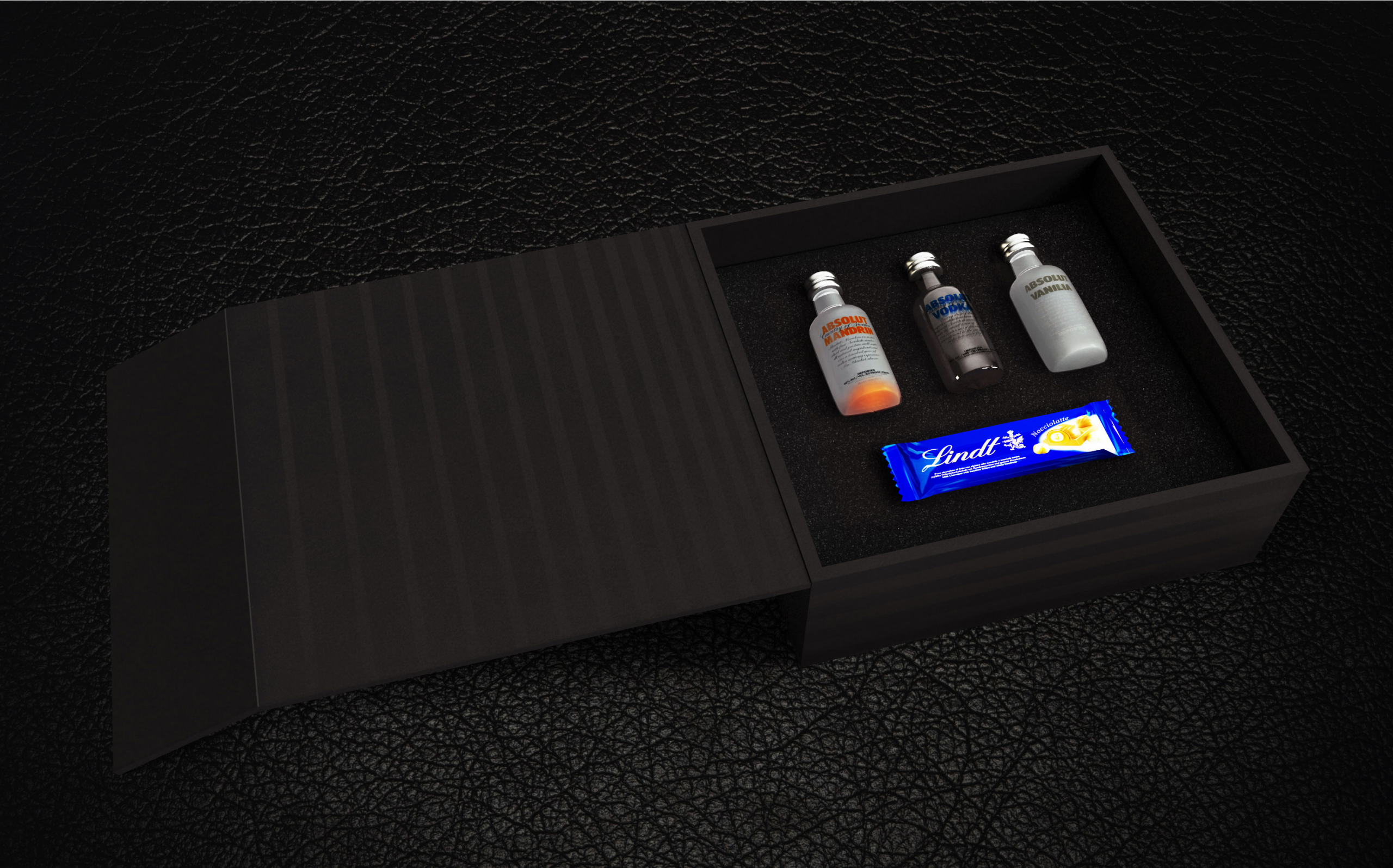Como resultado, foram desenvolvidas embalagens e um folder com as cores e os elementos visuais do produto. A embalagem dos atendentes foi projetada no formato quadrado, com um berço de espuma preta no seu interior e fechamento com ímã.