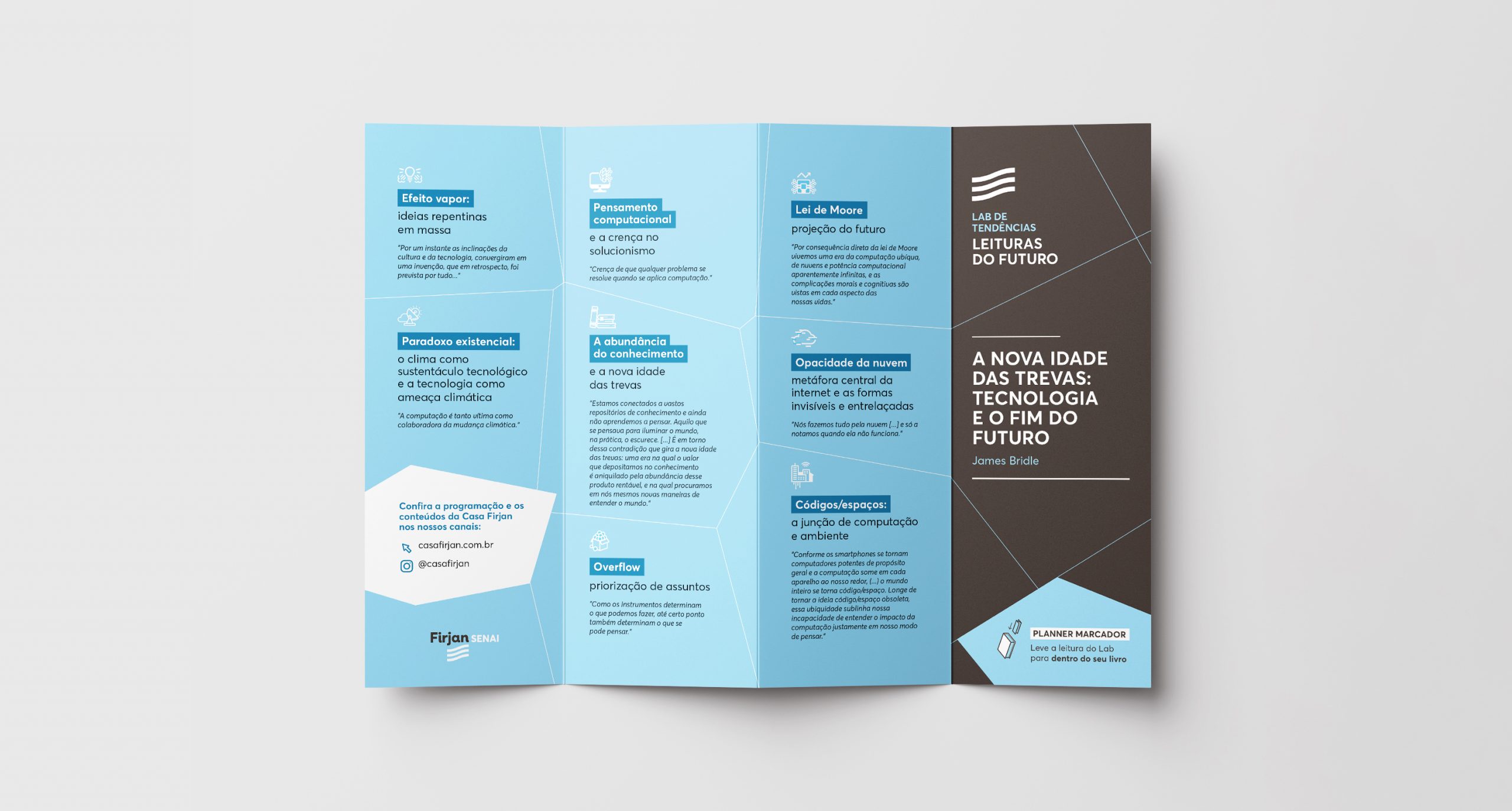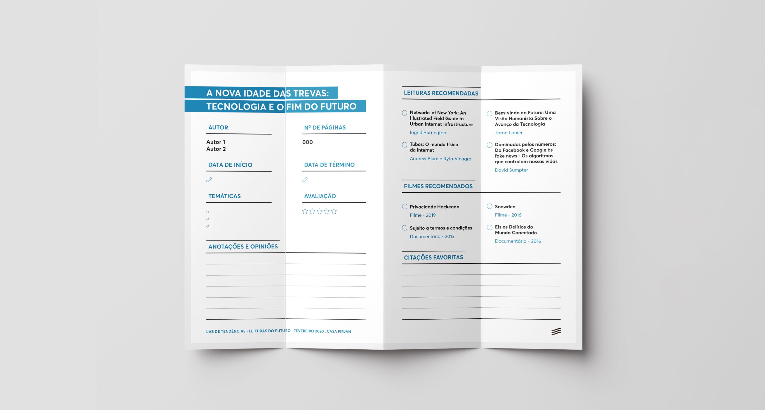 O desafio desse projeto foi elaborar um objeto impresso que pudesse ser utilizado durante ou após o evento “Leituras do Futuro” do Lab de Tendências da Casa Firjan. O objetivo do evento era promover discussões e reflexões sobre temas do futuro, a partir de livros eleitos no período.