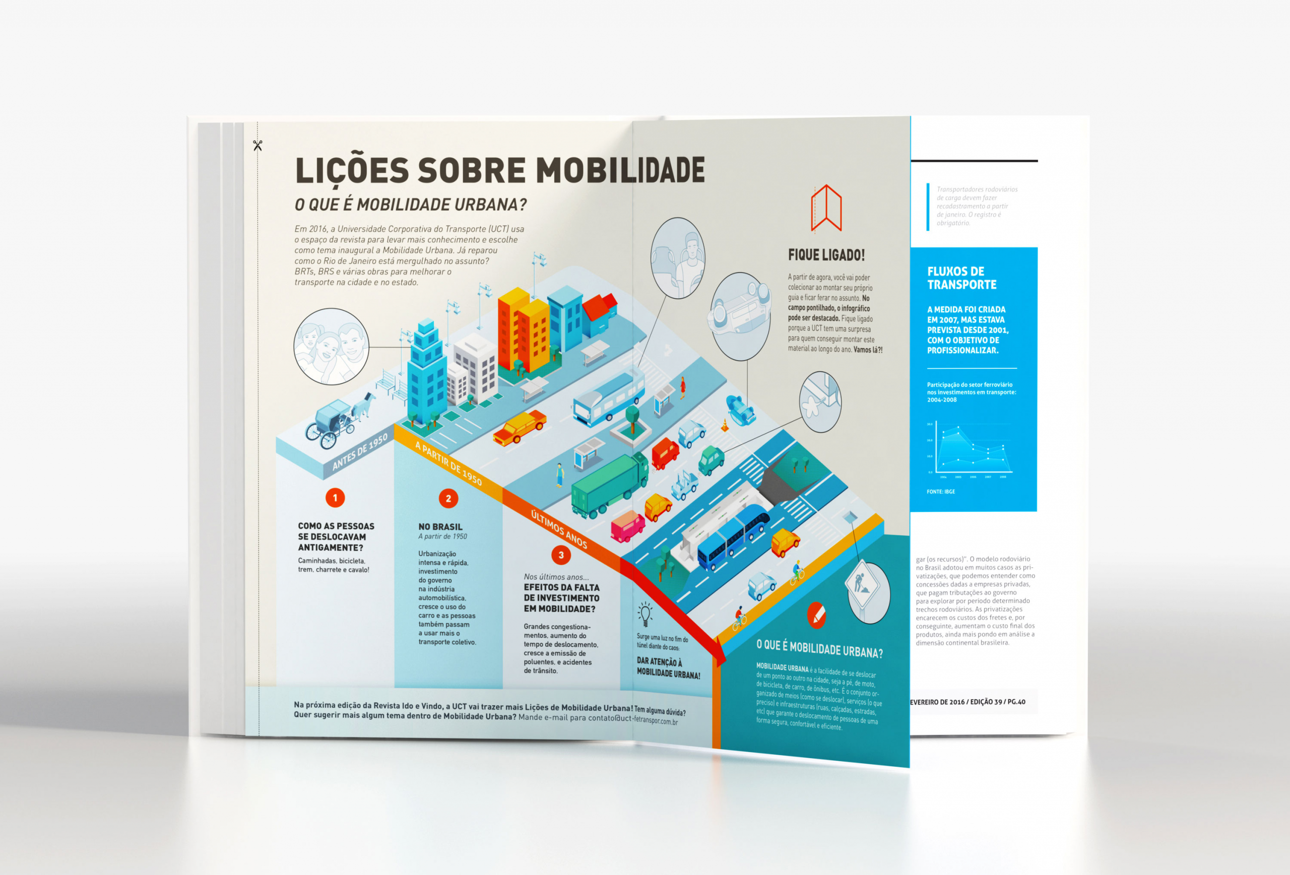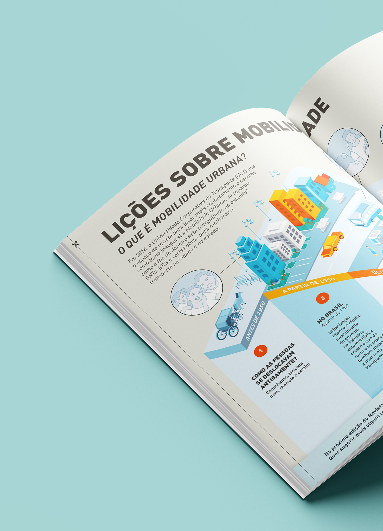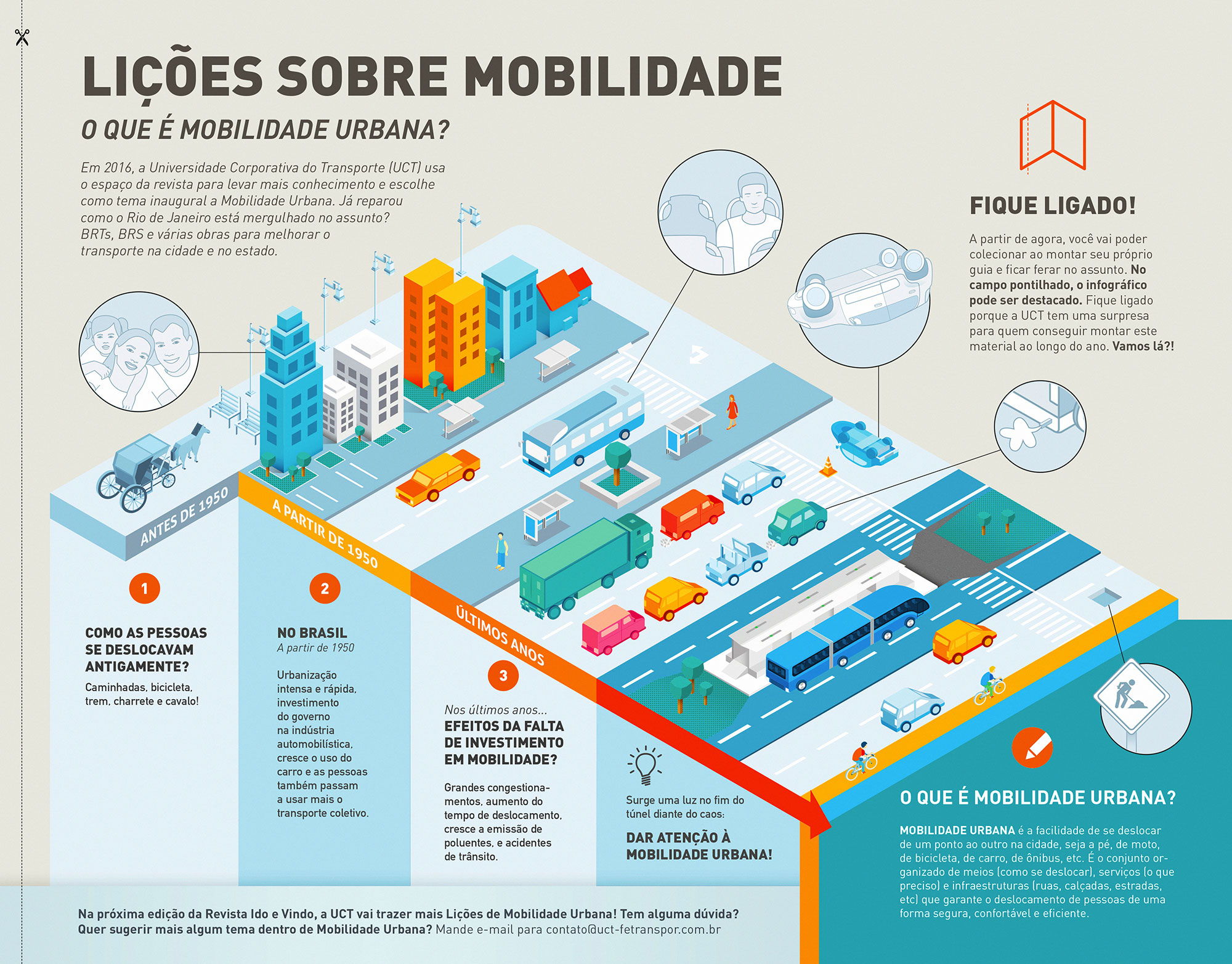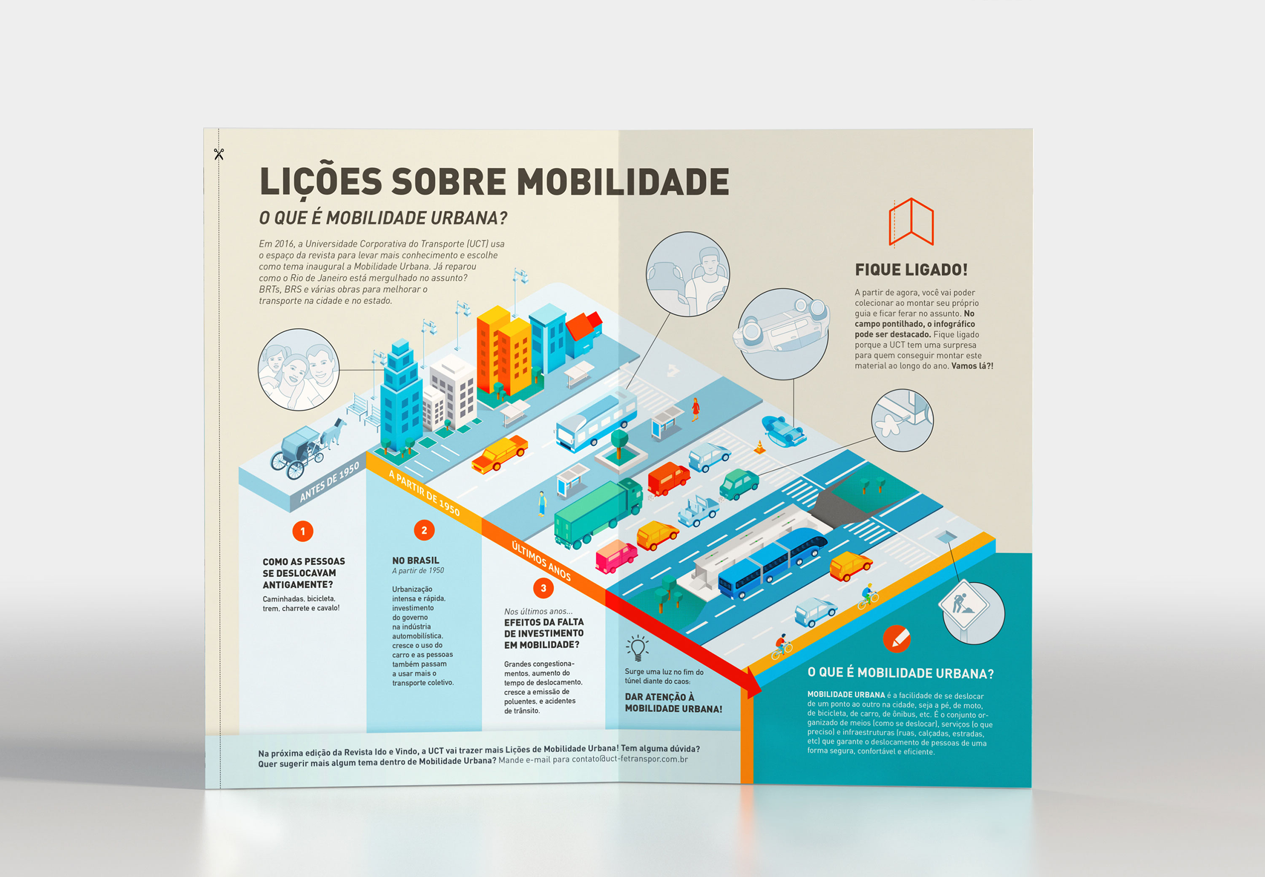 O desafio desse projeto foi elaborar uma série de cinco infográficos mensais para a Revista Indo & Vindo, da UCT / Fetranspor, com a finalidade de oferecer ao leitor um material informativo sobre mobilidade urbana, de fácil compreensão e colecionável. Desse modo, foram desenvolvidos infográficos em perspectiva isométrica que apresentavam, de forma visual e didática, os desafios e as oportunidades no tema “mobilidade urbana”. Esses infográficos compunham o miolo da revista e, por meio do acabamento gráfico picote/serrilha, podiam ser destacados e colecionados.