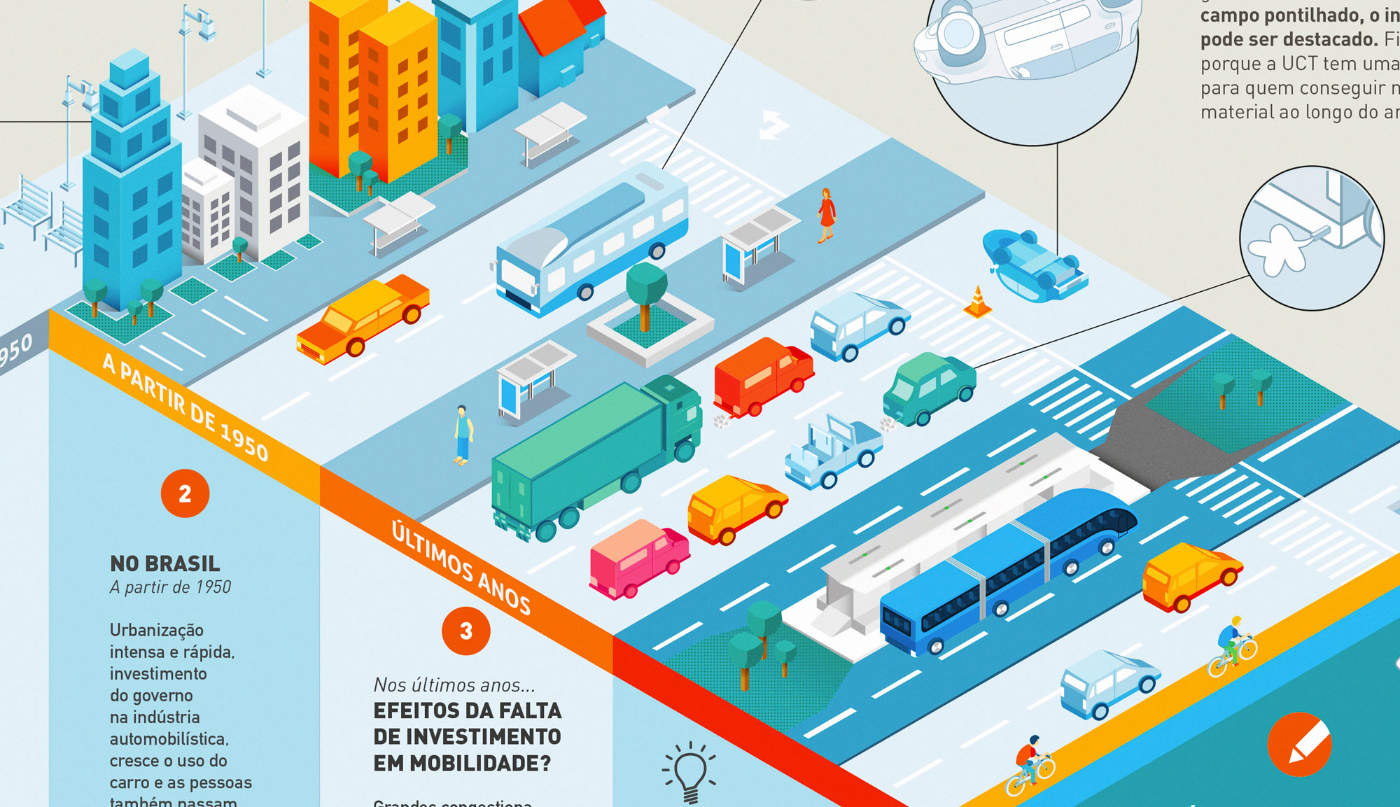 Para a primeira peça da série, foi criada uma linha do tempo que evidenciava as transformações nos meios de transporte ao longo dos anos e estabelecia metas para um futuro melhor, com investimentos em mobilidade urbana. Para cada etapa cronológica, foi estabelecido um código cromático, e os pontos principais do texto foram destacados por meio de “olhos” de imagens.
